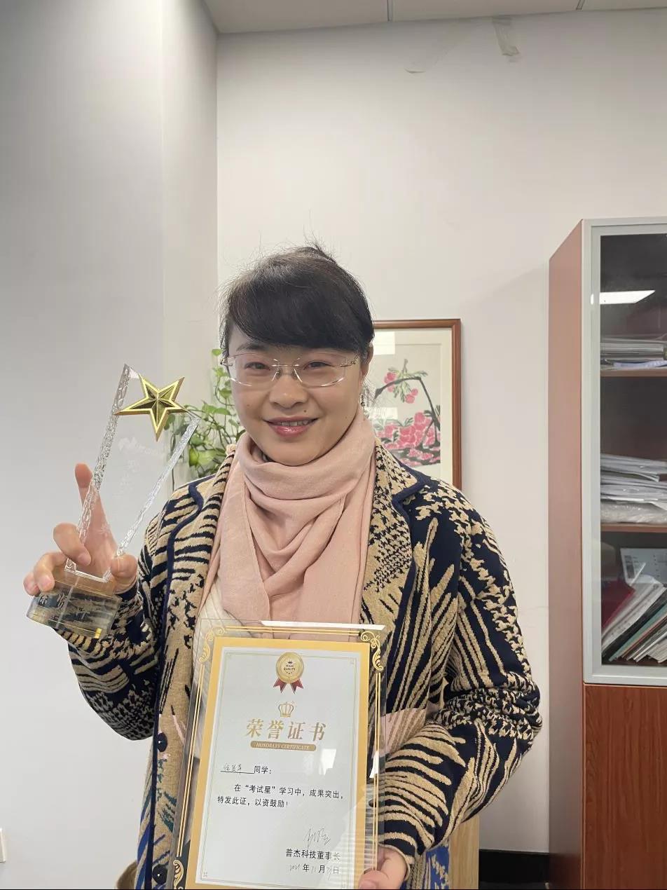 在考試星投入測(cè)試使用期,普杰科技執(zhí)行總裁徐賢萍對(duì)此項(xiàng)工作提供了大力支持,交流分享了許多寶貴意見(jiàn),充分肯定了工程部的工作內(nèi)容與態(tài)度,讓工程部全體員工在考試星的使用中得以投入更多的動(dòng)力與激情,特此授予“最佳貢獻(xiàn)獎(jiǎng)”。