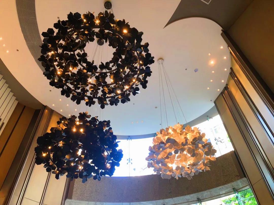 高聳的木質(zhì)弧形屏風(fēng)和黑白燈具