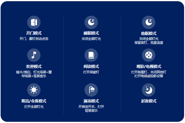 通過(guò)場(chǎng)景、取電、窗簾、空調(diào)的控制與管理實(shí)現(xiàn)節(jié)能。