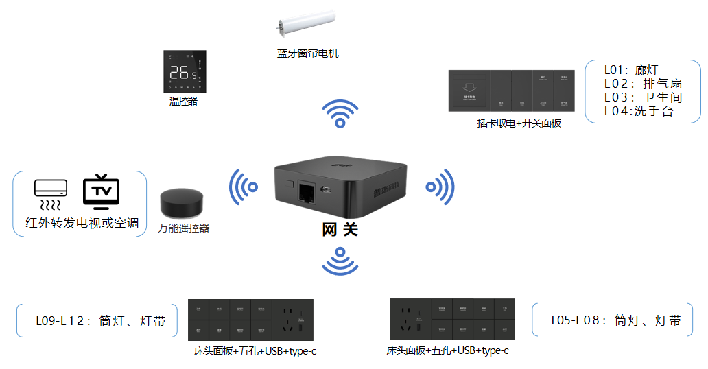 網(wǎng)關(guān)+智能驅(qū)動(dòng)器+智能窗簾電機(jī)+萬(wàn)能紅外方案