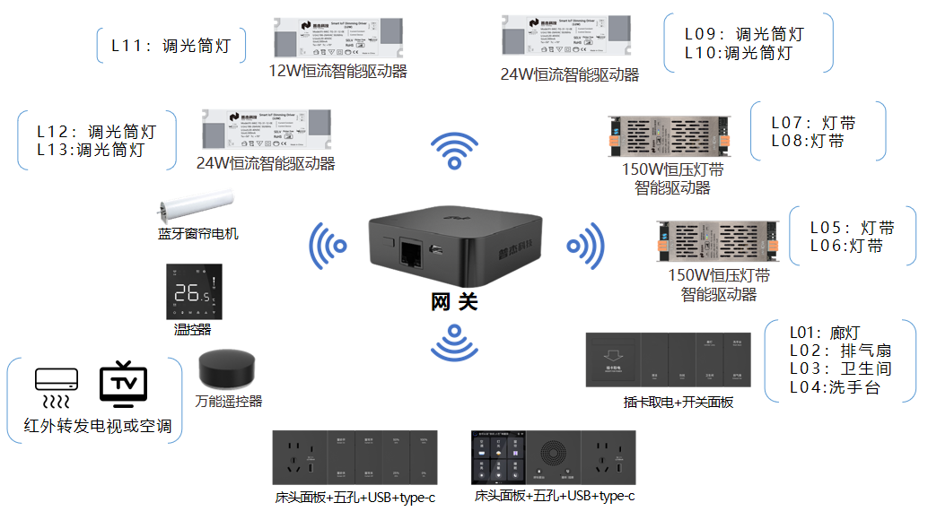 一體化主機(jī)RCU客房控制系統(tǒng)/分體式模塊RCU客房控制系統(tǒng)、有線全調(diào)光方案、經(jīng)典藍(lán)牙MESH無(wú)線方案、無(wú)線全調(diào)光方案;